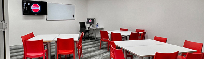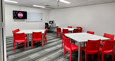 学校はゴールドコーストのビジネス街にあり、近くに大型ショッピングセンターもあるので大変便利。校舎は太陽の光を取り込む大きな窓を備えており開放的な環境。校内はイメージカラーの白と赤で統一されており、おしゃれなカフェのような雰囲気だ。