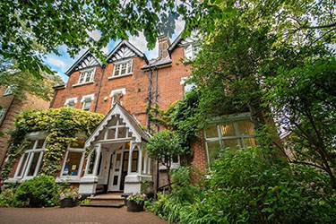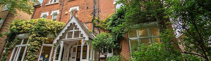 学校はロンドン北部の自然あふれる閑静な住宅街ハイゲートエリアにあり、ロンドン中心部まで地下鉄で約20分と便利。校舎裏には緑いっぱいの美しいイングリッシュガーデンがあり、先生や生徒同士でおしゃべりをしながらゆったりとくつろぐことができる。