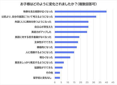 多くの親御様が「物事を見る視野が広くなった」と実感。ほかにも以前より自分の進路について考えるようになった、自立心が芽生えた、外国(人)に興味を持つようになった、英語力がアップしたなど短期間であっても成長した姿を感じられたとのお声をいただいています。